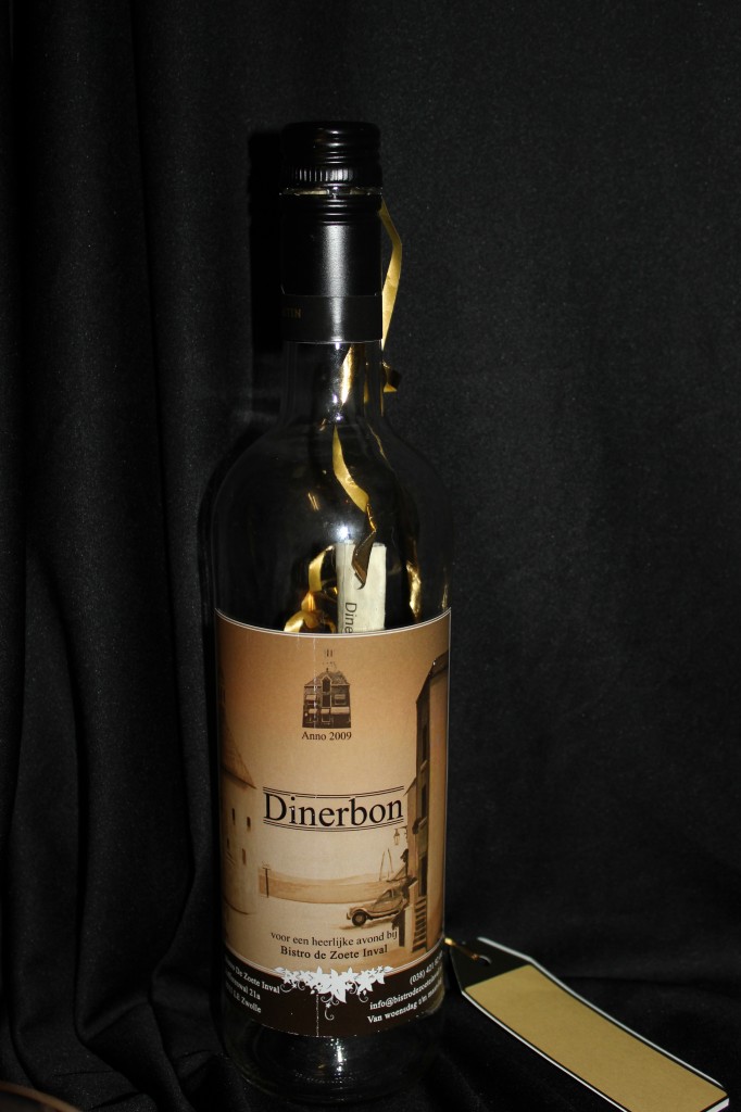 Heeft u iets te vieren en zou u iemand daardoor een leuk moment willen gunnen. Dan is het geven van een dinerbon een heel aantrekkelijk idee. Wij hebben een persoonlijke bon die u bij ons kan ophalen welke wordt gepresenteerd als “message in a bottle”.