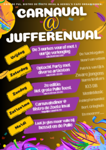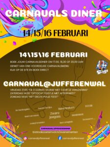Naar aanleiding van het succes van afgelopen jaar gaan we dit jaar speciaal voor de carnavalsvierders niet alleen een diner op zaterdag tm maandag, ook is er gezorgd voor een geweldige line up aan artiesten op vrijdag zaterdag en zondag: