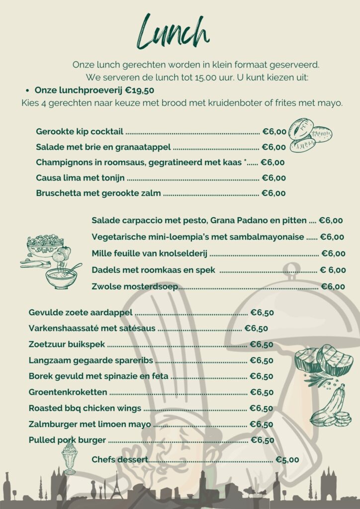 We hebben een aantal mooie ruimtes voor uw gezelschap om heerlijk te lunchen. Doe het eens op een andere manier. Laat u verleiden door onze bekende proeverij-gerechtjes, die wij tussen 12:30 en 15:00 uur serveren.